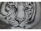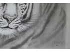Das Gesicht des Tigers wurde detailreich ausgearbeitet, während der Rest des Bildes diffus gezeichnet ist. Der nachdenkliche Ausdruck lässt den Tiger einsam aber majestätisch erscheinen.